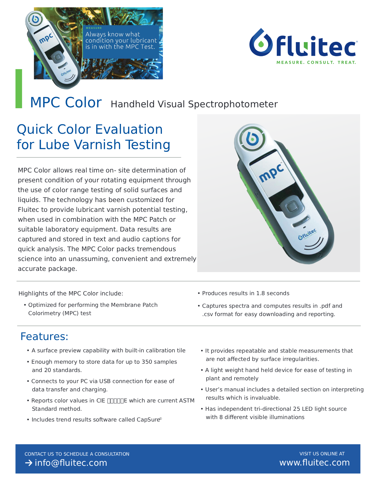 MPC Color allows real time on- site determination of present condition of your rotating equipment through the use of color range testing of solid surfaces and liquids. The technology has been customized for Fluitec to provide lubricant varnish potential testing, when used in combination with the MPC Patch or suitable laboratory equipment. Data results are captured and stored in text and audio captions for quick analysis. The MPC Color packs tremendous science into an unassuming, convenient and extremely accurate package.
